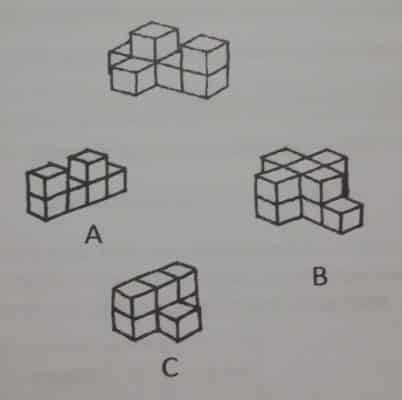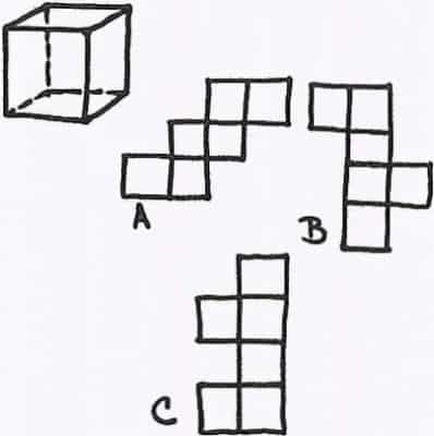 En este ejemplo en particular debemos tener la habilidad de saber con cuál de las figuras representada, forma un cubo. Para ello debemos mentalmente recrear los dobleces y obtener el resultado, que en este caso es la figura B.